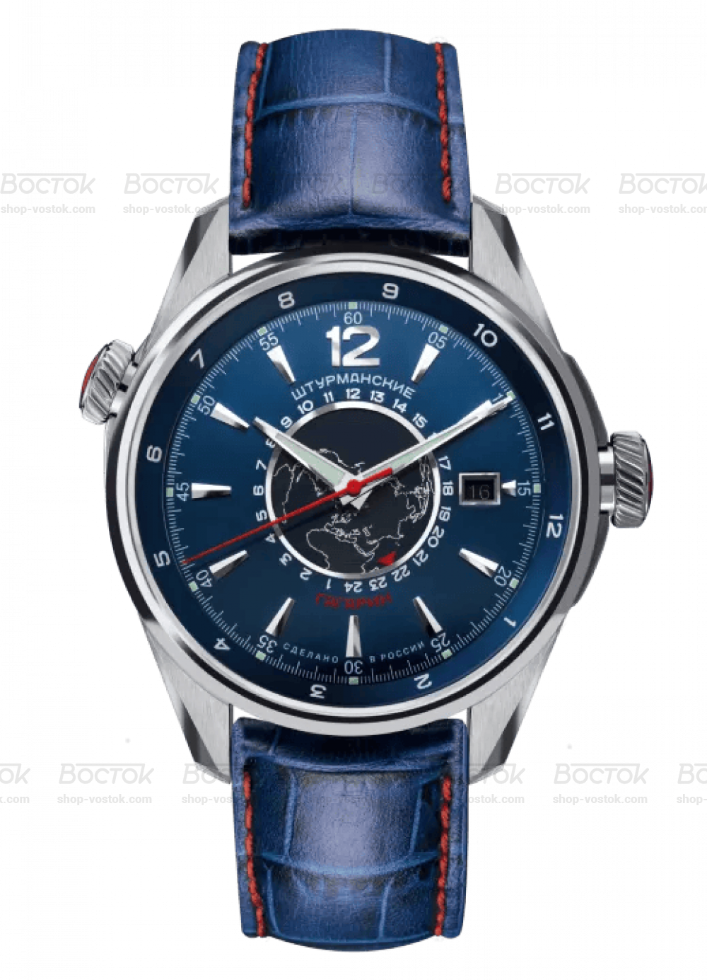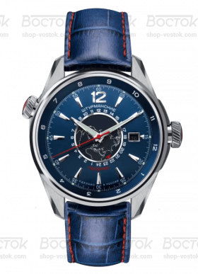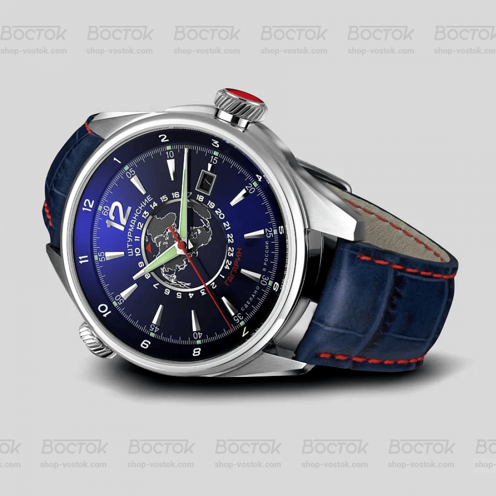 Гагарин День-Ночь – часы с настоящим мужским характером. С ними вы всегда готовы к новым открытиям и подвигам. Под стильным современным корпусом с изображением Земного шара на циферблате скрывается оригинальный советский механизм Восток 2432 – надежный, точный, способный стабильно работать в самых сложных условиях. Практичные и красивые часы с множеством функций. Синий кожаный ремешок с красной строчкой перекликается по цвету с циферблатом и секундной стрелкой. У часов сразу две временные шкалы – 24-часовая и 12-часовая, а также шкала второго часового пояса. Есть на циферблате и окошко для отображения текущей даты. Метки люминесцентные, что облегчает использование часов в темноте. Корпус из нержавеющей стали с водозащитной 10 АТМ и минеральное стекло надежно защищают часовой механизм и циферблат от повреждений.